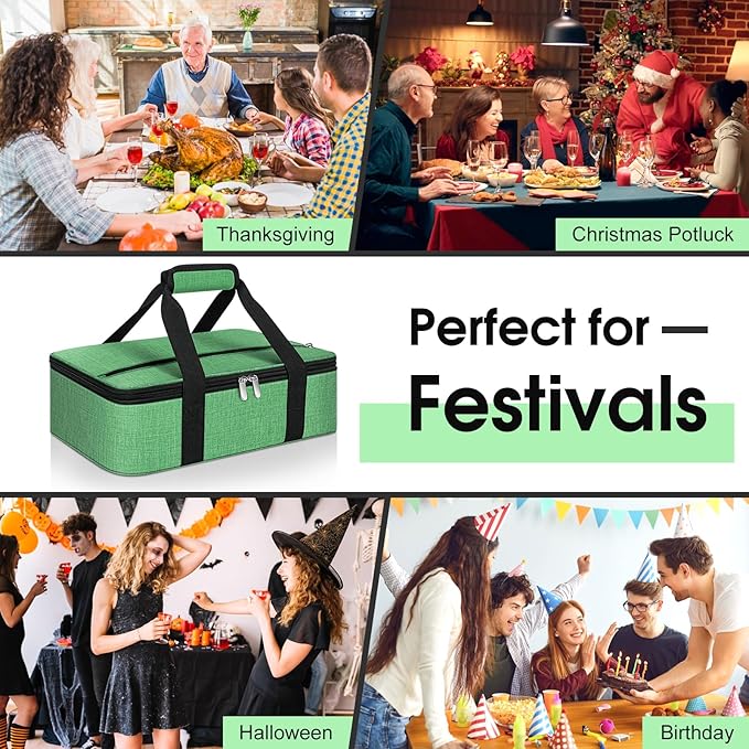 Insulated Casserole Carrier, Portable Casserole Carrier for Hot or Cold Food Lunch Tote Warmer or Cooler Bag, Lasagna Lunch Bag for Potluck Parties- Fits 9" x 13" Baking Dish-Green