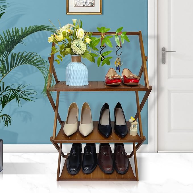 Foldable Bamboo Shelf, Folding Shoe Rack, Flower Rack, Camping Rack, No Installation Required, Portable, Space Saving, Multi-Purpose Storage Rack (Walnut, 3 Tiers with Boom)