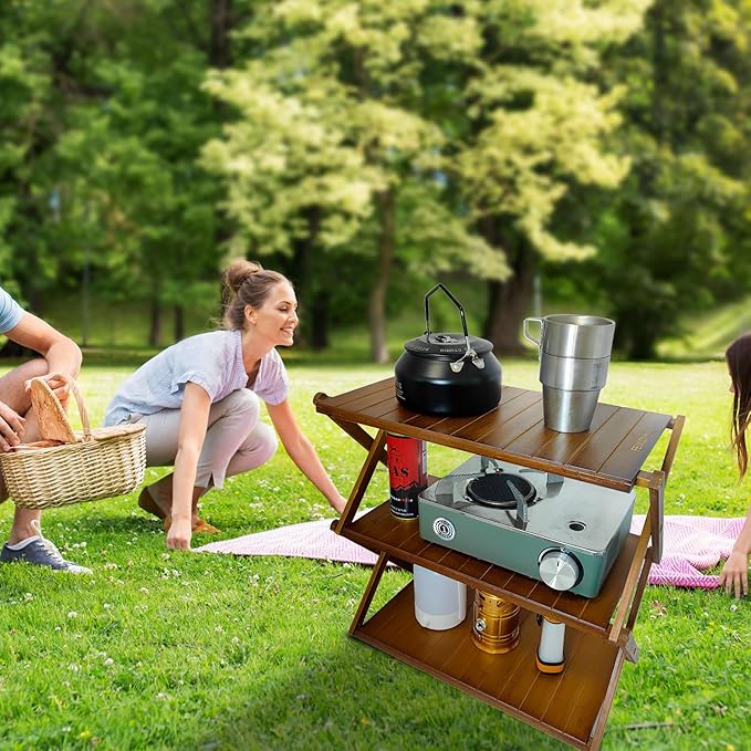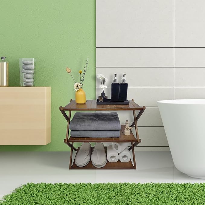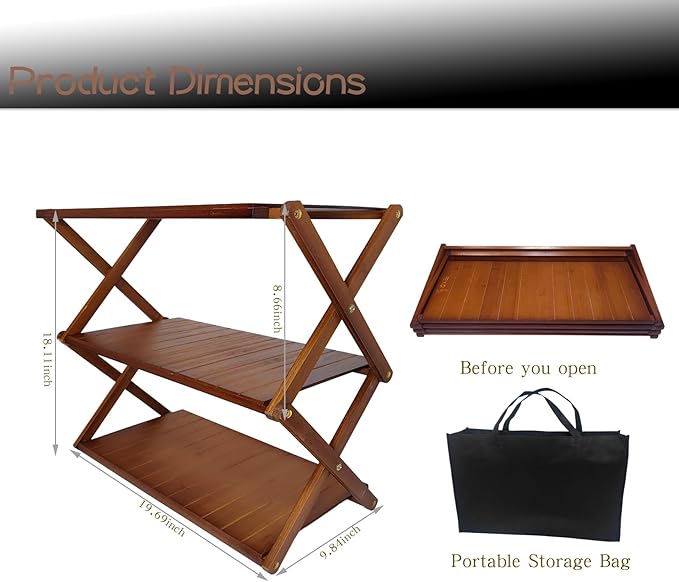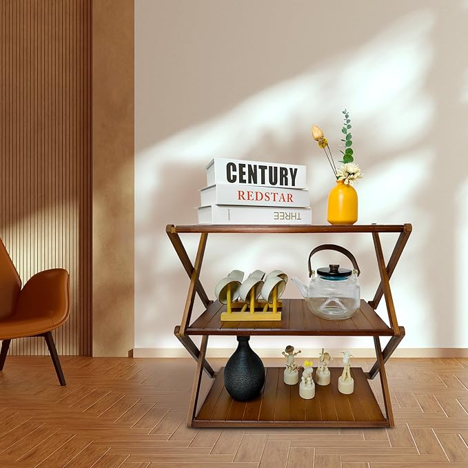 Foldable Bamboo Shelf, Folding Shoe Rack, Flower Rack, Camping Rack, No Installation Required, Portable, Space Saving, Multi-Purpose Storage Rack (Walnut,3 Tiers)