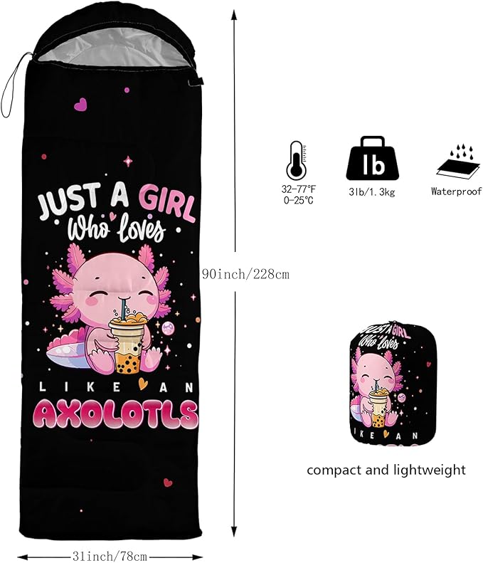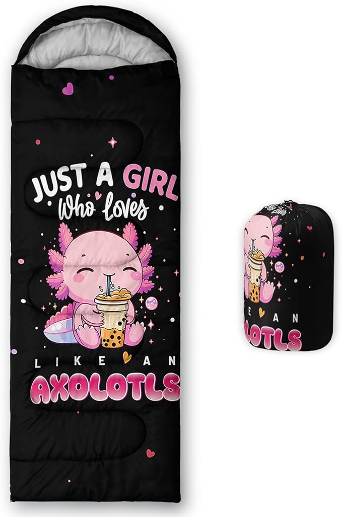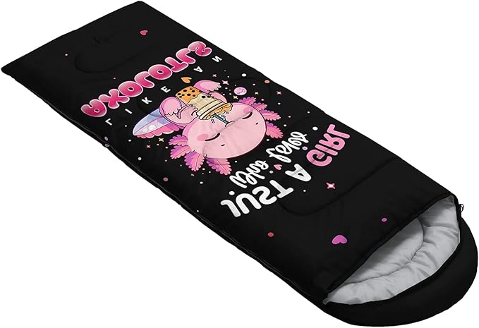 - 【Design】This cute children's sleeping bag is printed with a pattern of a salamander drinking milk tea.It is cute and childlike and suitable for little girls' outdoor activities.If your child also likes outdoor camping, you can give her this sleeping bag as a gift.