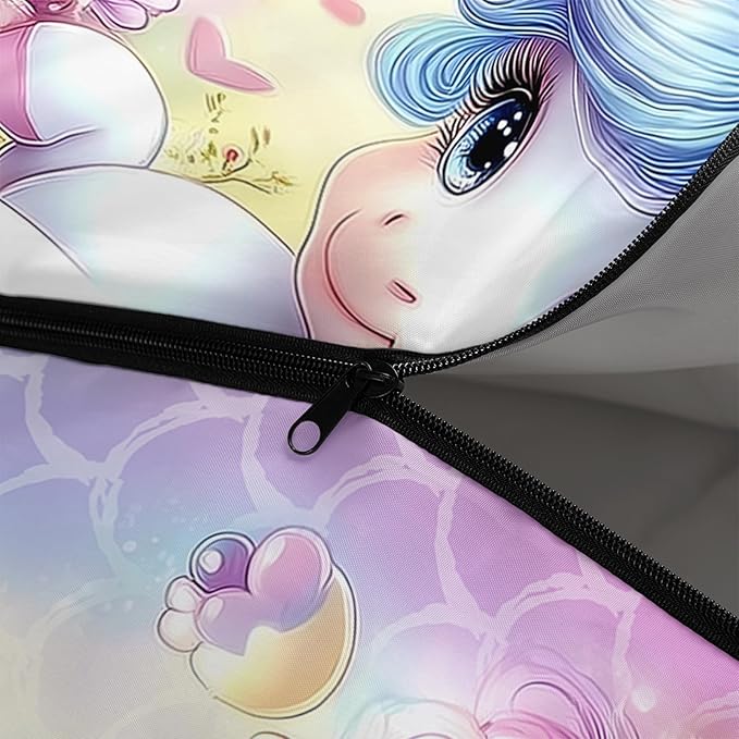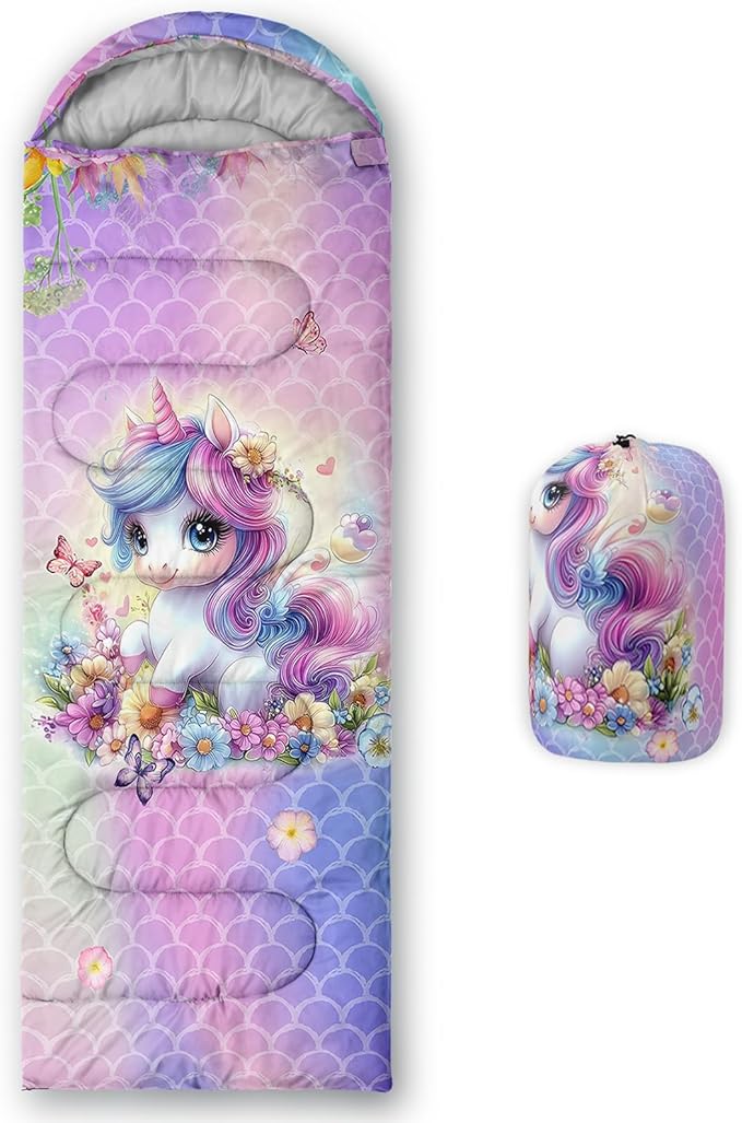 - 【Design】This colorful sleeping bag has a mermaid scales background and a beautiful unicorn pattern printed in the middle.It is full of childishness and vitality,bringing a unique atmosphere to your outdoor activities.