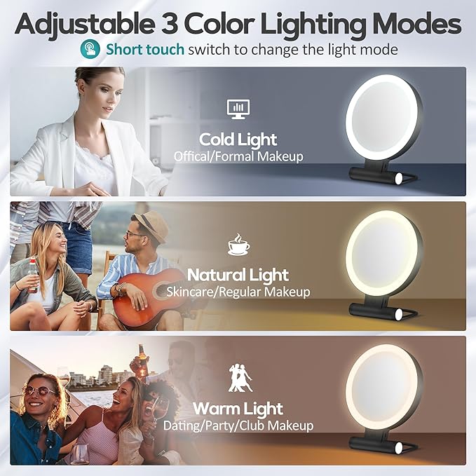 - 【 Adjustable Stand & 3 Colors】Features a flexible foldaway handle. The desk mirror with light can be hung on the wall or stand on any flat surface by adjusting the handle, and can be used as a hand mirror, tabletop mirror, and hanging mirror. 3 kinds of lights: warm light, white light, daylight, and bright light without glare, can protect your eyes. You can choose different light colors according to your needs