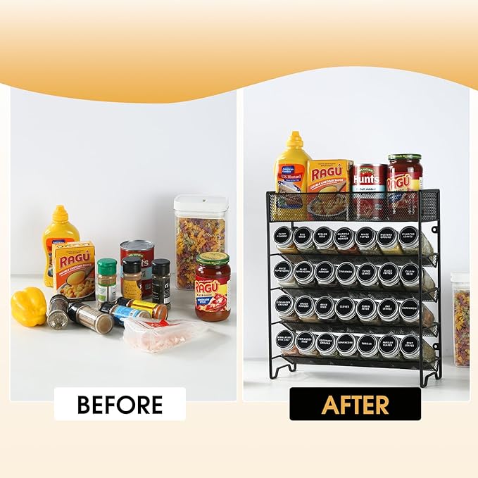 - 5 Tier Spice Rack - Made of strong steel and powder coatings electrostatic spray finished.Ideal sized spice rack organizer for cabinet, countertop, pantry, cupboard, door or wall mount. Inclined design make it easy to locate and quickly grab what you need, turn any mess of spice into an organized masterpiece .