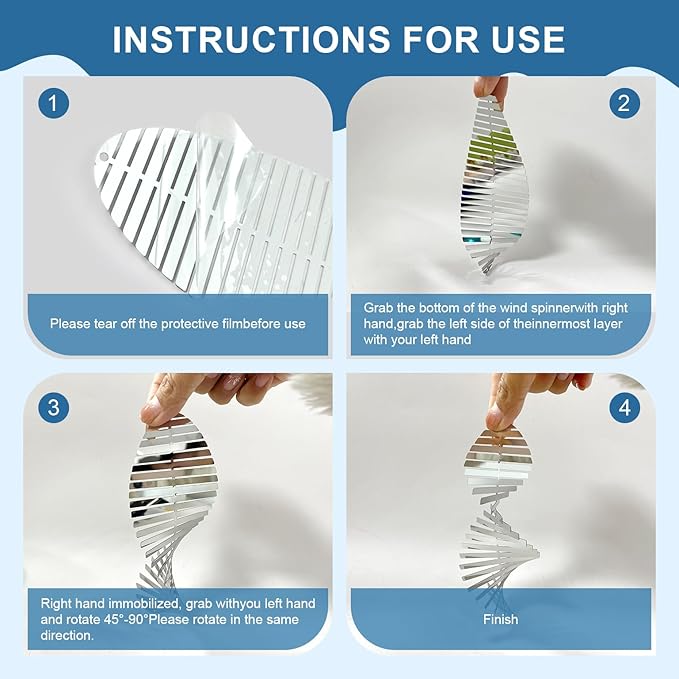 - 【Metal Material & Mirrors Reflect】Fishbone bird deterrents for outside patio is made of multi-layer stainless steel, smooth reflective surface catch the sunlight and reflect in with surroundings with a stunning 3D mirror effect, it's weight is almost 0.085KG, easy to carry. The 3D reflective wind spinners serves as an eye catching decoration for yard garden or home,beautiful to view from either inside or outside our windows, as they uses wind motion to spin and reflect the sunlight into the living room etc