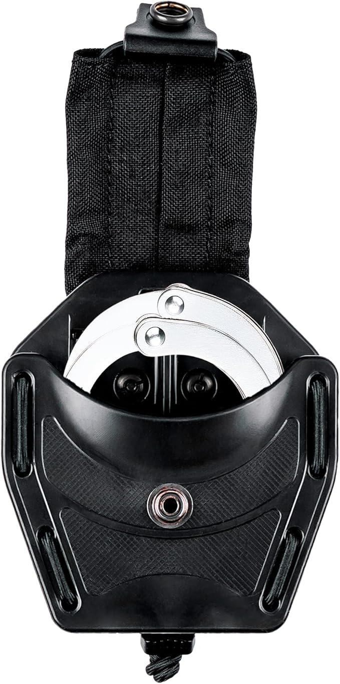 - UNIVERSAL HANDCUFF POUCH: Our handcuff holder is designed to fit most chain and hinged handcuffs, including ASP handcuffs, hinged handcuffs, chain handcuffs, and folding rigid handcuffs. The case has level 1 retention and is adjustable with a tubular elastic system for versatility. Universal equipment fit and secure carry/extraction through Smart tension technology.