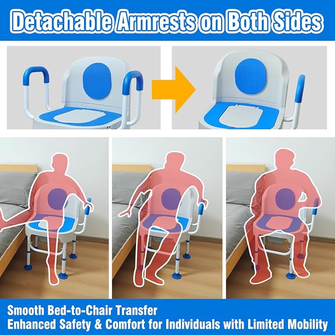 - [Detachable Supportive Armrests] Padded arms for seniors provide stable support, reducing joint strain and improving safety. The detachable armrests can be removed from both sides, allowing flexible placement (e.g., bedside) for barrier-free movement and accessibility. This emergency portable toilet minimizes fall risks and eliminates late-night trips to the bathroom, offering convenience and peace of mind.
