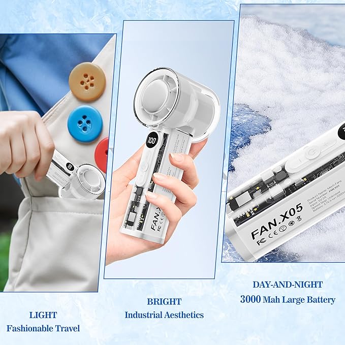 - HIGH SPEED PORTABLE FAN: Compact handheld design with ergonomic grip makes it perfect for on-the-go cooling needs, built-in rechargeable 3000mah battery with a range of 2-10 hours of use for a day's worth of activities.
