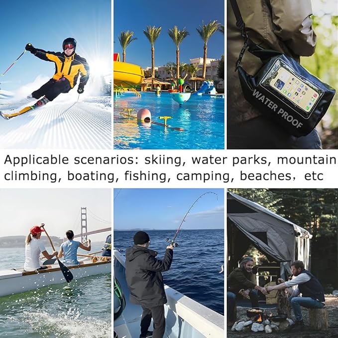 - 【5L WATERPROOF BAG】: 5L of large capacity! Larger storage space, more suitable for travel. A dedicated touch-screen accessible compartment safely stores phones up to 7" diagonally while allowing you to stay connected without compromising safety.