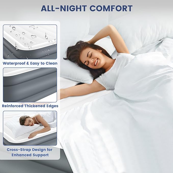 - Advanced Leakproof & Durable Construction – Features reinforced PVC with cross-strap technology and a tough Polyester-PVC composite layer that's 30% more puncture-resistant than standard air mattresses. The military-grade materials prevent air leaks while supporting up to 800 lbs, ensuring stable, all-night comfort.