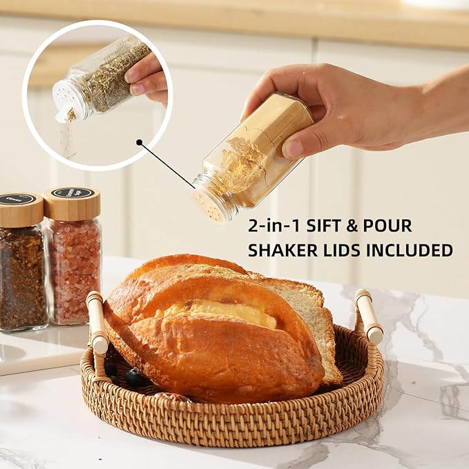 - Versatile 2-in-1 Shaker Lids:Features a dual-aperture system – fine holes for powdered spices and a flip-top for herbs/grains. Switch modes instantly without changing lids. Bamboo lids maintain freshness with airtight seals.