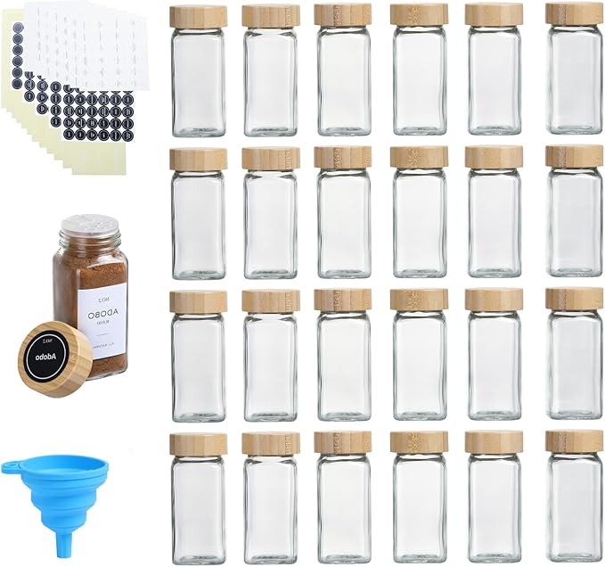 4 oz Glass Spice Jars with Bamboo Lids, Clear Empty Jars with Labels Stickers, Collapsible Funnel, Seasoning Storage Bottles for Spice Racks (24 Pack)