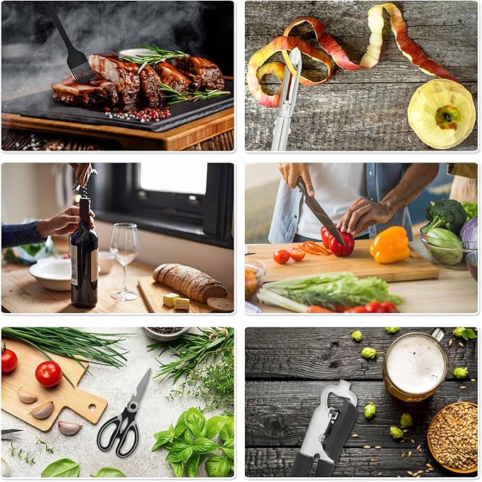- Mess kit for camping with multifunctional tools and board: This camping utensils cooking set comes with a durable chopping board, two sheath knives, and a multifunction bottle and can opener.Whether slicing meats, prepping vegetables, or opening food containers, this kit handles varied cooking needs for campers, hikers.It's a practical solution for food preparation in outdoor environments, replacing multiple bulky items with an all-in-one kit packed for space-saving storage