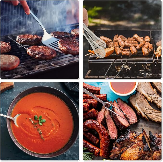 - Portable utensils set with bag for camping cooking: This camping utensil set includes a stainless steel spatula, tongs, soup ladle, oil brush, peeler, meat fork, 2 steel skewers, and 2 extendable roasting forks. organized in a durable storage bag, it's designed for outdoor cooking, RV camping, hiking, and backyard BBQs. The set solves the hassle of scattered tools with a neatly packed design, ideal for camp chefs who need reliable access to essentials during travel, picnic, or campsite meals