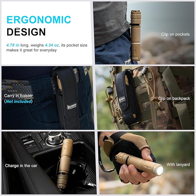 - Best for Everyday Carry: The pocket flashlight is 4.78 in long, weighs 4.34 oz, its pocket size makes it great for everyday carry. The pocket clip and lanyard of the flashlight make it very convenient to carry with you. And there is optional flashlight holster in our store, multiple ways for carrying to choose