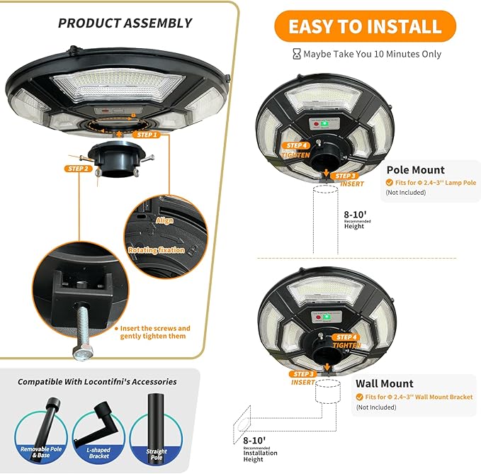 - Upgraded Lighting Visibility: The Locontifni solar street lights shine at 360° omnidirectional, 180% more than Rectangular solar street lights. The outdoor solar post light has 750 LED super bright light beads, illuminating an area of up to 2000 sq.ft. Suitable for illuminating dark corners, neighborhoods, garages, gardens, barns, streets, yards, Parking Lots, etc