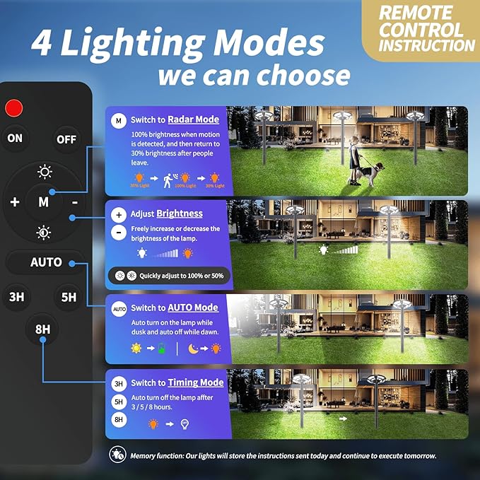 - Multiple Lighting Modes: The solar yard post light provides three multi-function lighting modes: radar sensor mode, timed lighting mode, and continuous lighting mode. When motion is detected, the radar sensor mode adjusts to 100% power brightness and switches to 30% when the person leaves. The timed lighting mode allows you to set the lighting time (3H/5H/8H) with the remote control. Continuous illumination mode provides continuous 100% power brightness until the battery is depleted