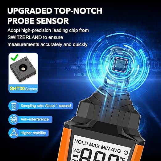 - HIGH-PRECISION THERMOMETER HYGROMETER - Unlike traditional temperature humidity meter, this digital hydrometer adopts a high-precision semiconductor sensor from SWITZERLAND to ensure measurements accurately and quickly. With short response time and strong anti-interference ability, more secure and accurate, the humidity meter can be used for a wide range of applications.