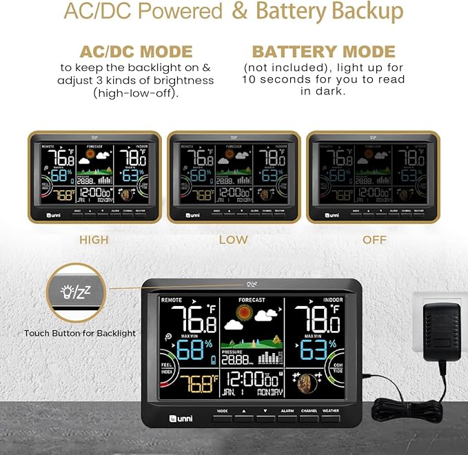 - AC/DC Powered & Battery Backup - AC/DC MODE: to keep the backlight on & adjust 3 kinds of brightness (high-low-off). BATTERY MODE(not included), light up for 10 seconds for you to read in dark.