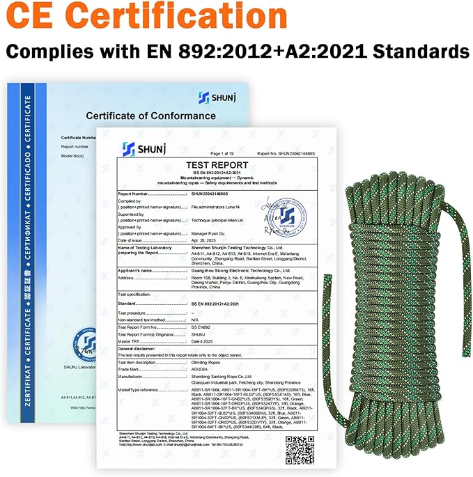 - CE Certified: Our static climbing rope meets the CE Certification of EN 892:2012+A2:2021 Standards (Certificate No. : SHUN2504214880SC), ensuring quality control. UV-Resistant & Abrasion-Proof give the rope a longer service life.