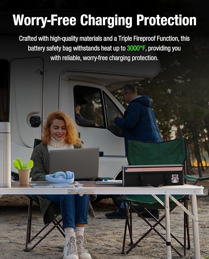 - 【Worry-Free Charging & Travel Safe】Waterproof, dustproof, and radiation-shielded to extend battery life. Fire-resistant inner lining prevents battery combustion during chargins. Ideal for air travel and perfect for camping, RVs, and home storage