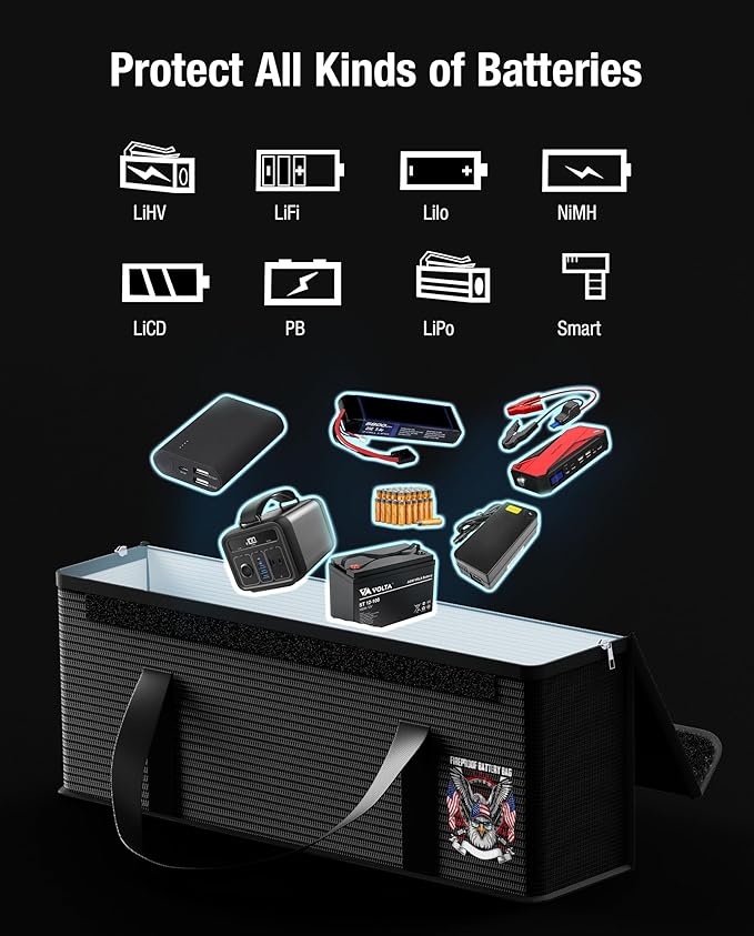 - 【Fireproof & Explosion-Proof Safety】Crafted from fireproof fiberglass, liquid silicone, and non-woven insulation, our lipo battery bag withstands extreme heat up to 3000°F—ensuring safe charging, storage, and transport for lithium-ion/LiFePO4 batteries. Prevents explosions, fires, and thermal runaway, while also protecting valuables like documents, jewelry, and electronics
