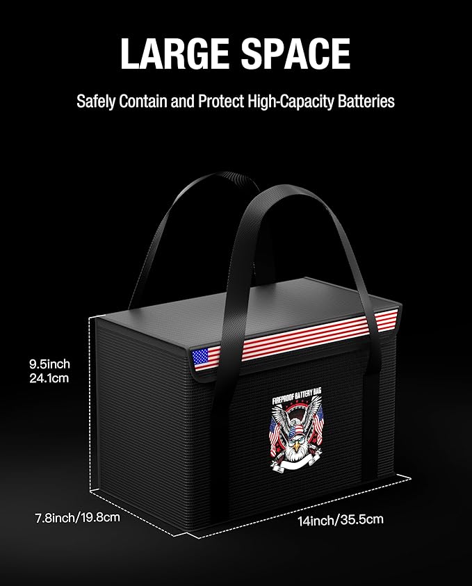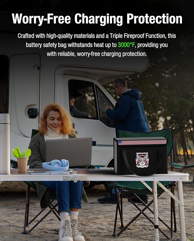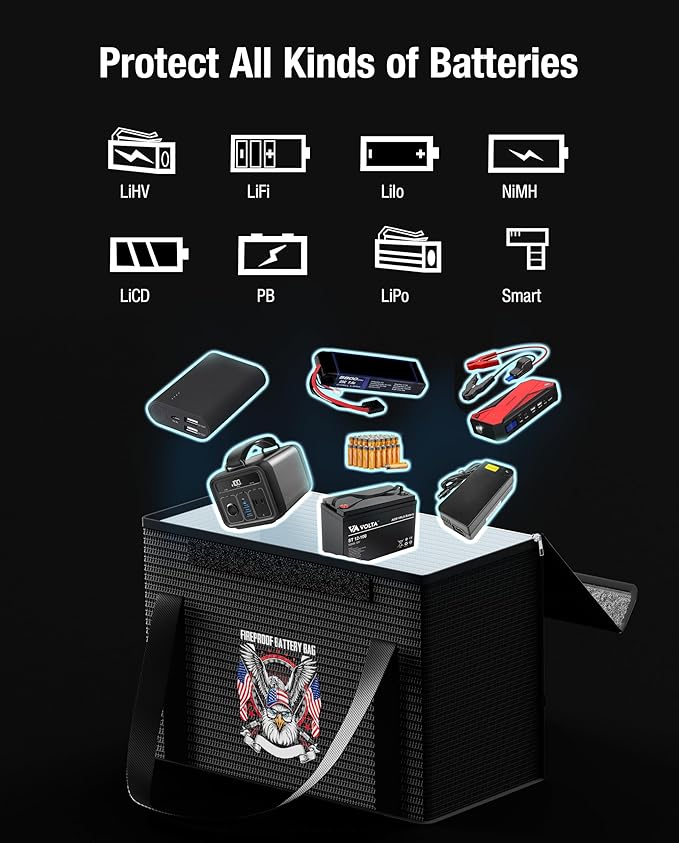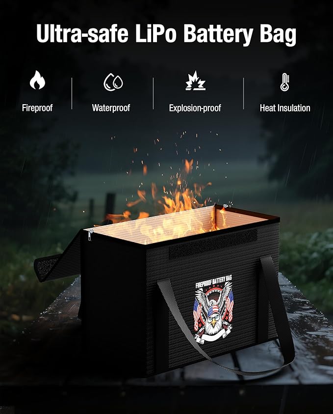 - 【Fireproof & Explosion-Proof Safety】Crafted from fireproof fiberglass, liquid silicone, and non-woven insulation, our lipo battery bag withstands extreme heat up to 3000°F—ensuring safe charging, storage, and transport for lithium-ion/LiFePO4 batteries. Prevents explosions, fires, and thermal runaway, while also protecting valuables like documents, jewelry, and electronics