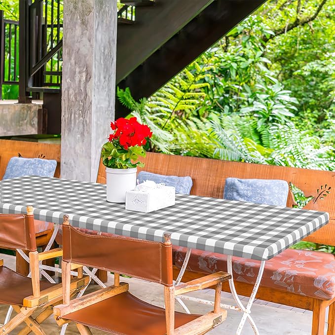 misaya Buffalo Rectangle Picnic Tablecloth, 6 Foot Elastic Fitted Vinyl Table Cloth with Flannel Backing, Waterproof Plaid Table Covers for Dining, Camping, Outdoor (Grey and White, 30" x 72")