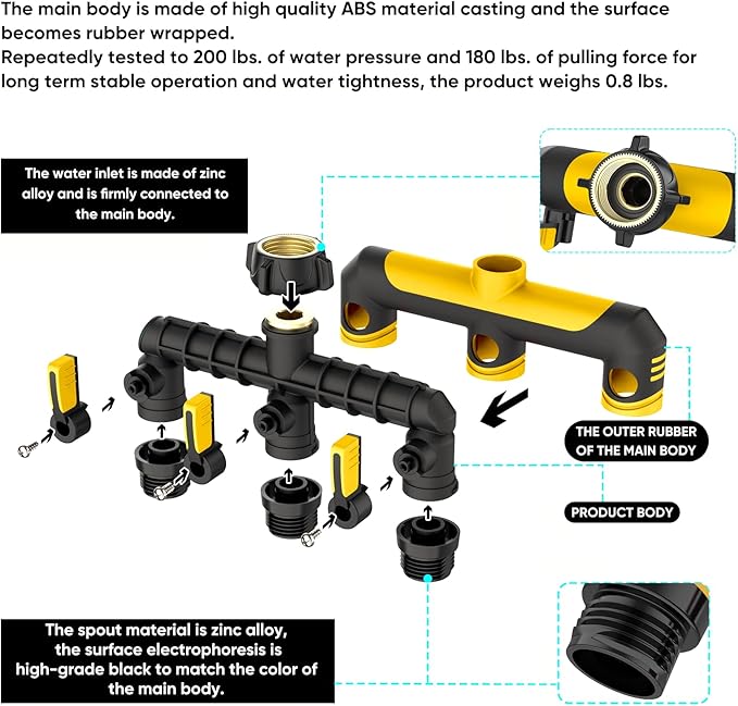 Garden Hose Splitter, 3/4-Inch Hose Manifold, Outdoor Faucet Adapter - Soft TPR Covering - Lightweight, Non-Slip, Sun-Resistant 3-Way Valve(yellow)