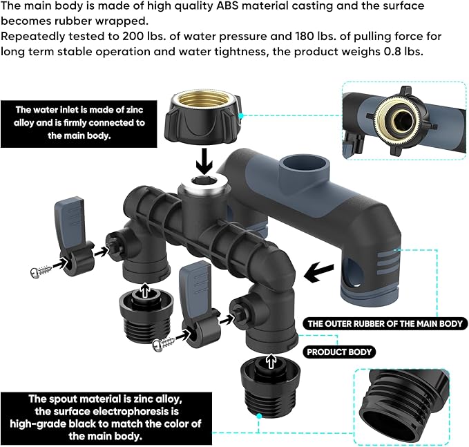 - 4:The new design of the High Flow Garden Hose Diverter is a major improvement and is especially suited for use by gardeners who regularly regulate the flow of water in different garden areas.With an enlarged bore of 0.4 inches, it is able to withstand high flow rates and high water pressure without restricting the flow of water through, and its individual spout discharges 0.77 pounds of water per second.