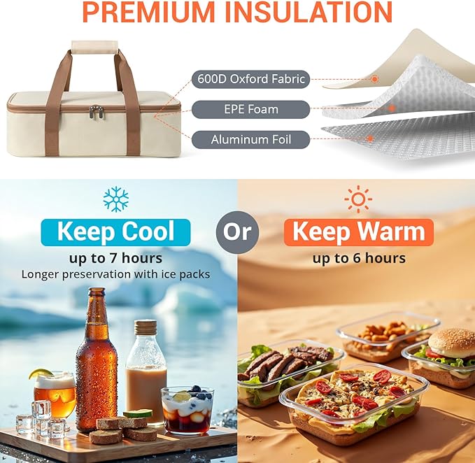 - 【Multi-Purpose and Travel-Ready】With its lightweight design and large capacity, this insulated bag is perfect for transport to potluck parties, BBQs, tailgates, and cookouts. Use it as an insulated cooler for cold desserts or a thermal bag for warm dishes—it’s built for any occasion.