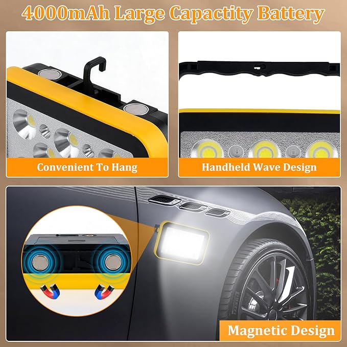 - Magnetic Design & Hanging Capability: With a magnetic attachment function, it can be attached to metal surfaces effortlessly, freeing your hands. Our rechargeable work light can also be hung wherever you need it