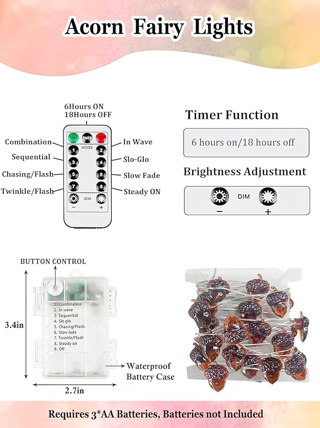 - Cute Acorn Decoration Lights: These adorable acorn-shaped fairy lights emit a warm amber glow, making them perfect for Thanksgiving decorations and autumn-themed garlands. Each strand includes a waterproof battery case and a remote control, and is powered by 3 AA batteries (not included)