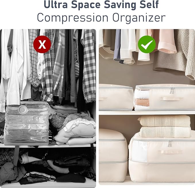 - Innovative Compression Storage Bags:Our compression organizer keeps the air inside during compression, protecting the fibers and down in your clothes and comforters from damage. Save space while ensuring that your items remain fluffy and as good as new when you open them the following year! They can be safely stored in your attic or basement. The dimensions of the compression bags are 11.8 inches (compressed: 5.9) x 16.54 inches x 21.26 inches