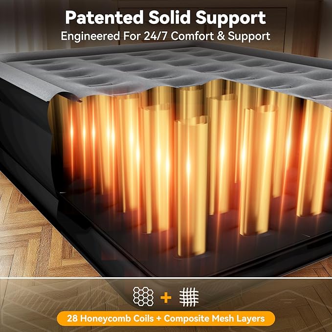 - 【2025 Upgraded Patented Coils & Structure Design–Covered By U.S. Patent NO. US012108880B2】The full size air mattress with built in pump features 28 internal coils in a honeycomb pattern, reinforced by composite mesh and fiber layers.This advanced structure distributes weight evenly across the 18" height, prevents sagging, and supports up to 660lbs without bottoming out