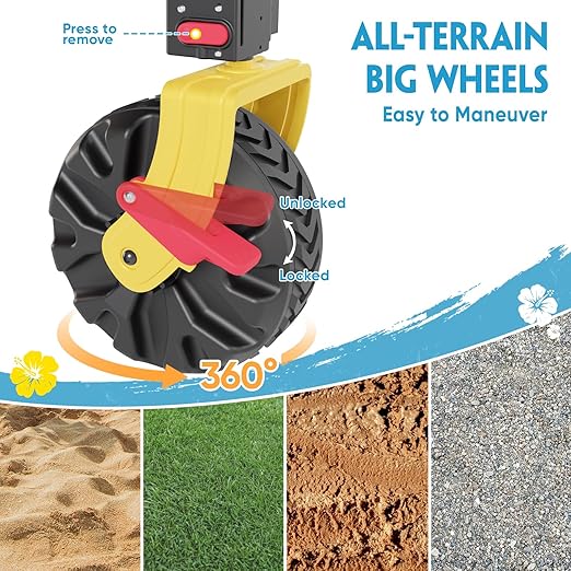 - All-Terrain Wheels with 360° Rotation & Brakes: Oversized wheels glide smoothly over sand, gravel, grass, or pavement. Front wheels swivel 360° for easy steering, while rear wheel brakes provide secure parking on uneven terrain