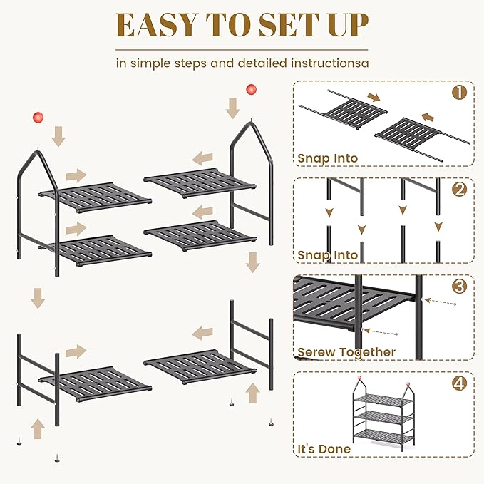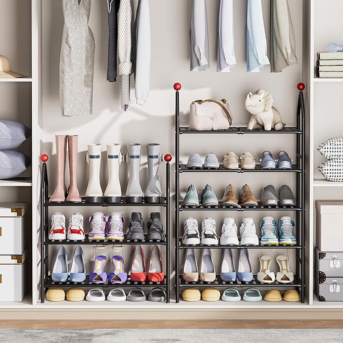 - 💪 【Sturdy Construction That Lasts】 Crafted from rust-resistant metal tubes and a durable steel frame, this black shoe rack for closet supports heavier shoes and gear without bending. Reinforced plastic shelves add strength and keep your shoe shelf from sagging over time.
