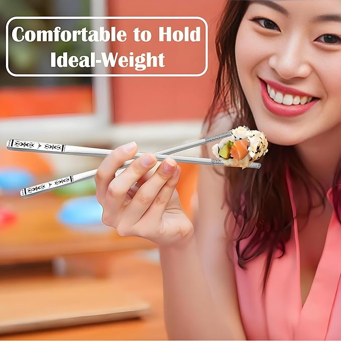 - Premium Quality: The reusable chopsticks are made from food-grade 304 stainless steel. Premium sturdy material, square design & light weight, comfortable to hold and less rolling,The laser etching on the stainless steel chopsticks tip, easier to grab food