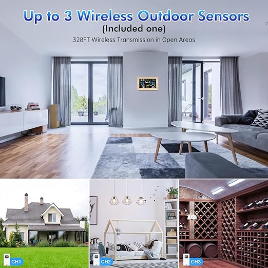 - ๐ฏ-๐๐ต๐ฎ๐ป๐ป๐ฒ๐น ๐ช๐ถ๐ฟ๐ฒ๐น๐ฒ๐๐ ๐ช๐ฒ๐ฎ๐๐ต๐ฒ๐ฟ ๐ฆ๐๐ฎ๐๐ถ๐ผ๐ป๐: The digital weather station includes an outdoor sensor that monitors the outside temperature and humidity. If desired, up to two additional sensors can be added to the weather station in order to monitor three locations simultaneously. It is designed with a USB output port with 5V/1A, which can be used to charge other devices. The additional remote sensors can be purchased in the store. Search for product ID B0DHRR5T5L.