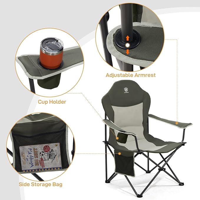 - MULTIFUNCTIONAL USAGE- The adjustable armrests can be moved to different heights to accommodate the user's posture, which allows the user to customize the chair to their specific needs. Ideal for camping, sporting events, outdoors, barbecues, and backyard lawn use