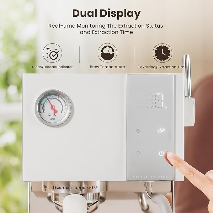 - ๐๐ฎ๐๐ฅ ๐๐ข๐ฌ๐ฉ๐ฅ๐๐ฒ ๐๐๐๐ฅ-๐๐ข๐ฆ๐ ๐๐จ๐ง๐ข๐ญ๐จ๐ซ๐ข๐ง๐ : The Gevi espresso machine features an intuitive touch control panel that makes it easy to customize your brewing settings. Equipped with an extraction pressure gauge and digital display screen, it allows real-time monitoring of extraction pressure, time, and temperature, making the coffee-making process more intuitive.
