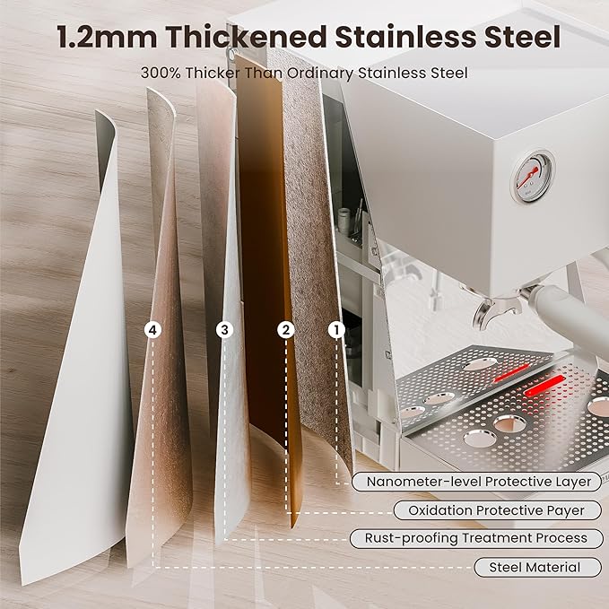 - ๐๐ก๐ข๐๐ค๐๐ง๐๐ ๐๐ญ๐๐ข๐ง๐ฅ๐๐ฌ๐ฌ ๐๐ญ๐๐๐ฅ ๐๐จ๐ฎ๐ฌ๐ข๐ง๐ : This espresso machine features a thickened stainless steel exterior, which is 300% thicker than ordinary stainless steel materials. Featuring four layers: the Steel Material, Rust-proofing Treatment Process, Oxidation Protective Layer, and Nanoscale Protective Layer. Making it more durable and longer-lasting, and also easier to clean.