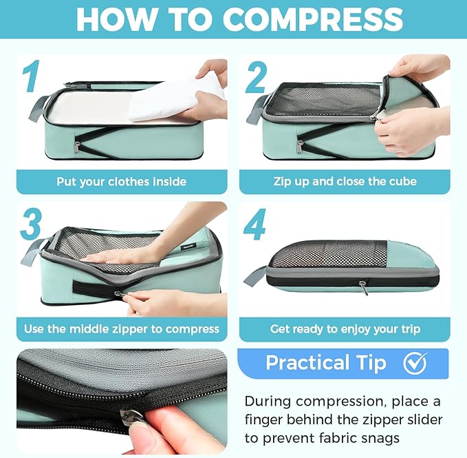 - HOW TO MAKE THE COMPRESSION HAPPEN? - There Is a Extra Zipper Outside Of Our Compression Packing Cubes Which Can Be Zipped Up To Flatten The Cubes And Save The Space As Far As Possible. It Just Works Like a Vacuum Sealer. You Just Need To :1) Fold Your Clothes And Flatten Them 2)Pack Clothes In The Cubes And Zip The Normal Zipper. 3)Put A Finger On The Back Of The Zipper In The Space When Compressing The Packing Cubes In Case The Zipper Get Stuck In Fabric.