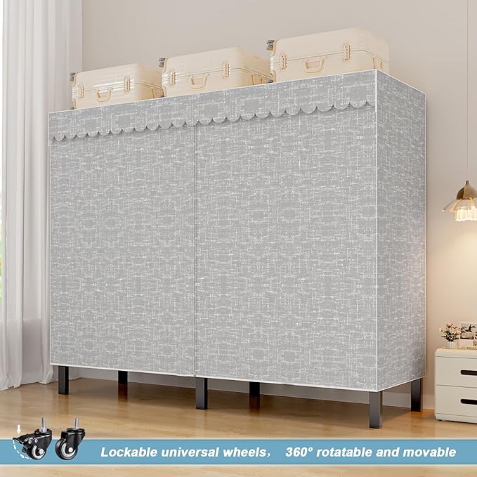 FPIGSHS Heavy Duty Clothes Rack with Cover 2000LBS Foldable Portable Wardrobe Closet for Hanging Clothing Rolling Garment Rack on Wheels for Bedroom Closet System (E(Gray Cover, 41.3in)