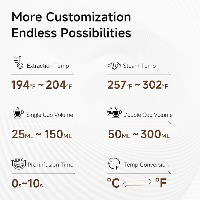 - Optional Program Range: single cup 25~150ml, double cup 50~300ml; hot extraction temperature range 194°F~204°F, cold extraction range 77°F; steam temperature range: 257°F~302°F; pre-infusion time range: 0~10 seconds; temperature display conversion: ℃ and ℉ can be converted to each other.