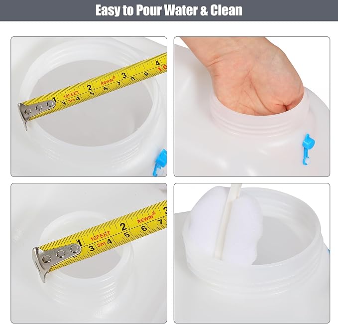 - Easy to Clean the Jug: Dimension is 15.7''x6.7''x12.6''/40cmx17cmx32cm. The camping water container with spigot has two barrels. One is large enough to put your hand inside and clean it easily.