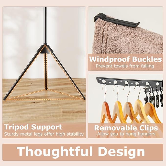 - [Sturdy Construction]: Made of solid metal tubes, the tripod base provides stability to support a full load of laundry. Windproof buckles on the rods help keep towels secure.