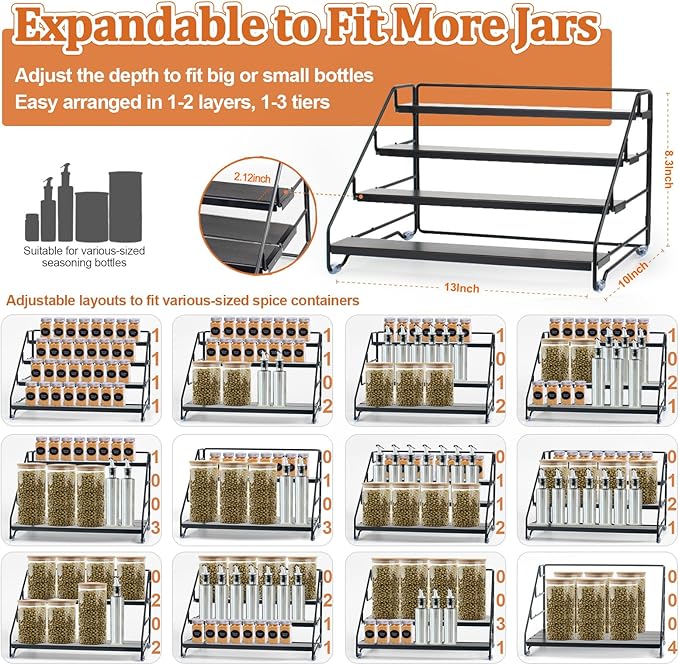 - 【4-Tier Stepped Storage Maximizes Space】The stepped design of this spice rack for countertop helps you easily see and grab all your spices. With 4 tiers and 8.4" height. Each spice rack organizer measures 13" wide, 10" deep, and 8.4" high. Please ensure your cabinet space is large enough. It's perfectly sized for most kitchen cabinets, countertops, and pantry shelves.