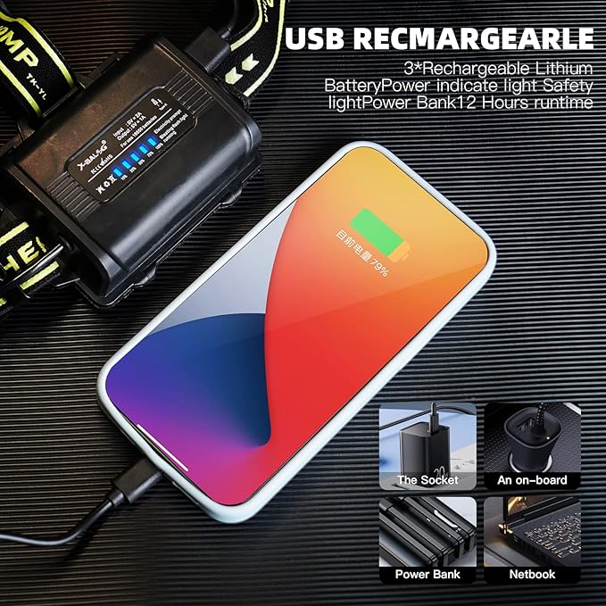- 【USB Charging & Power Output】RFIUCH headlamp is specially designed with USB charging and power output design, you can use any USB port to charge the headlamp when you are outdoors, and you can also use the headlamp as a power source for battery life when your mobile phone runs out of battery, and they are professionally designed with circuit protection, you don't need to worry about charging safety at all.