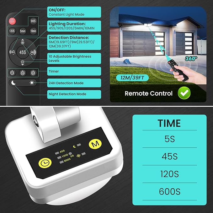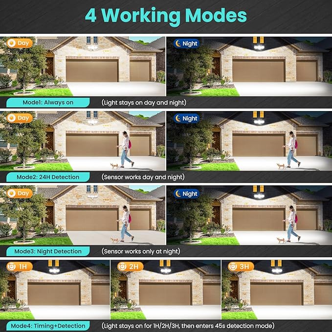 - 【Versatile Operating Modes】Choose the right setting for any situation with 4 distinct modes: 24-Hour Detection, Night-Only Detection, Continuous Light, and Timer Mode (1/2/3 hours before reverting to detection). In detection modes, the sensor flood light intelligently switches off when motion ceases, significantly reducing power consumption