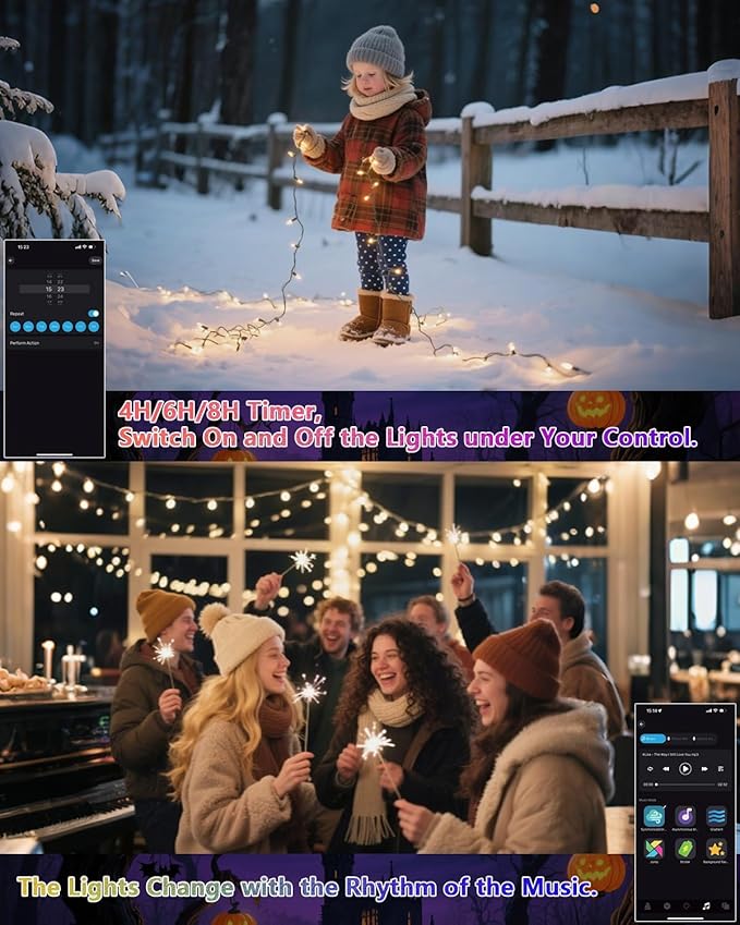 - [Timer & Memory Features]: This Halloween LED string lights offers a selectable 4/6/8-hour auto-off timer for energy-efficient use. Its built-in memory function automatically resumes your last lighting mode after power restarts, eliminating repetitive setup.